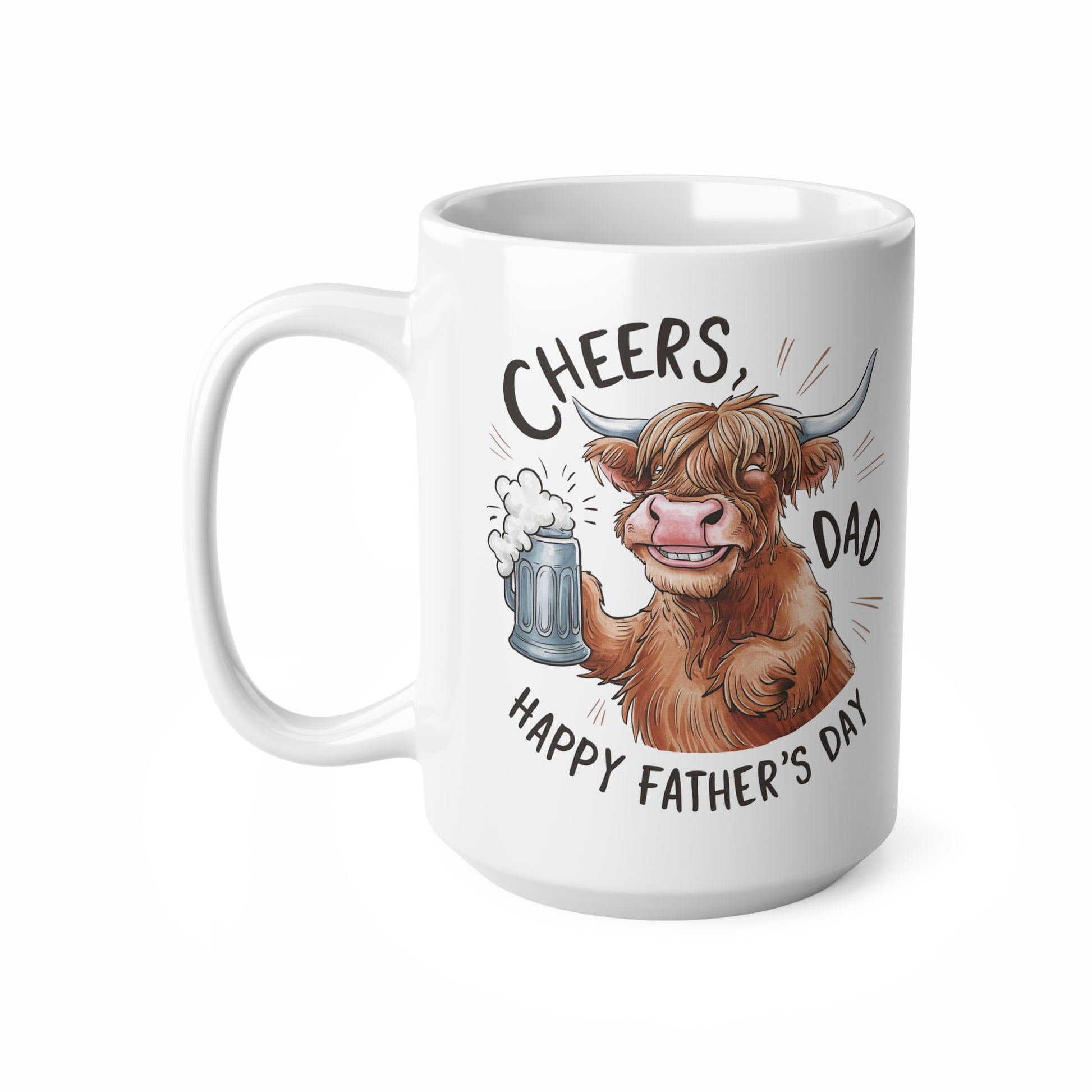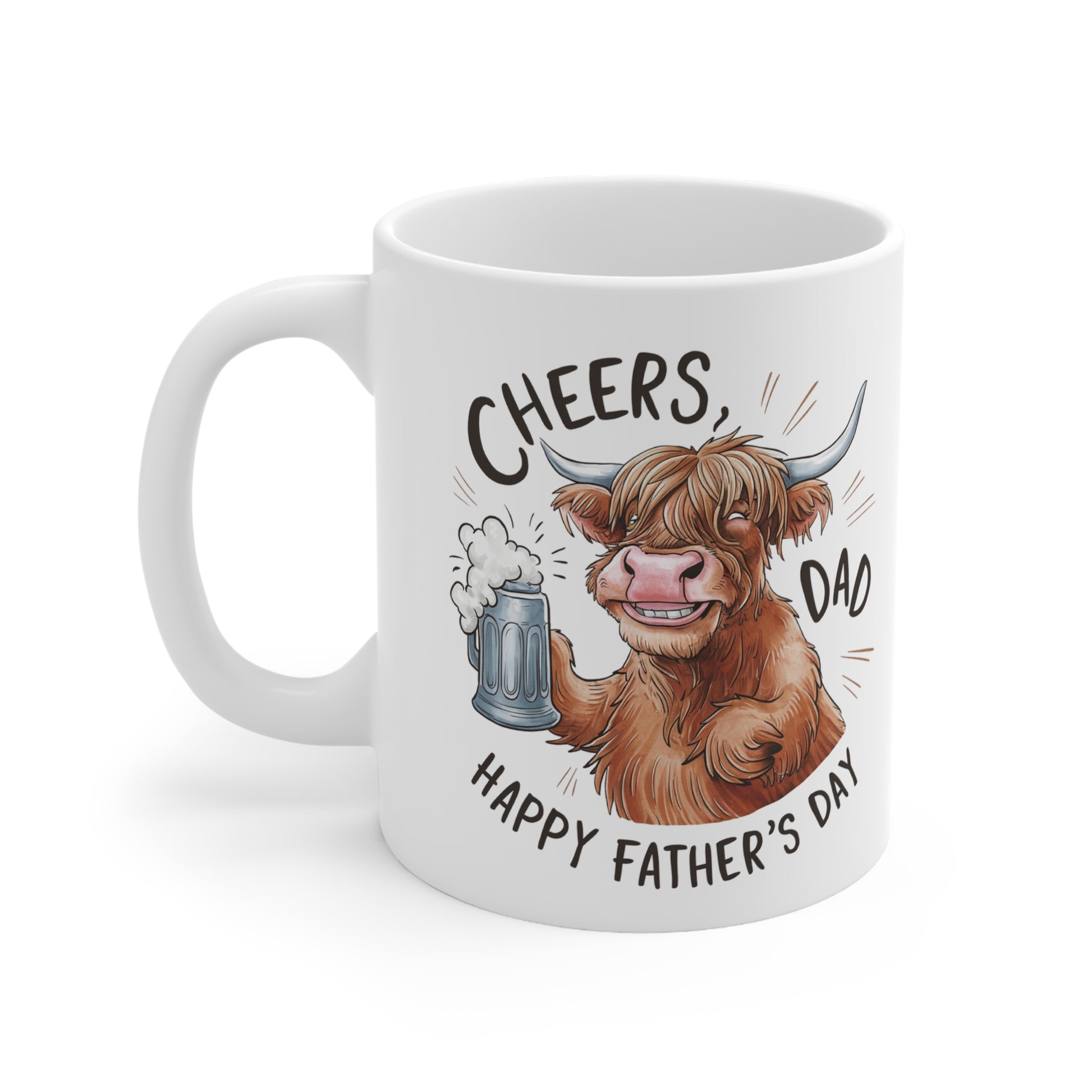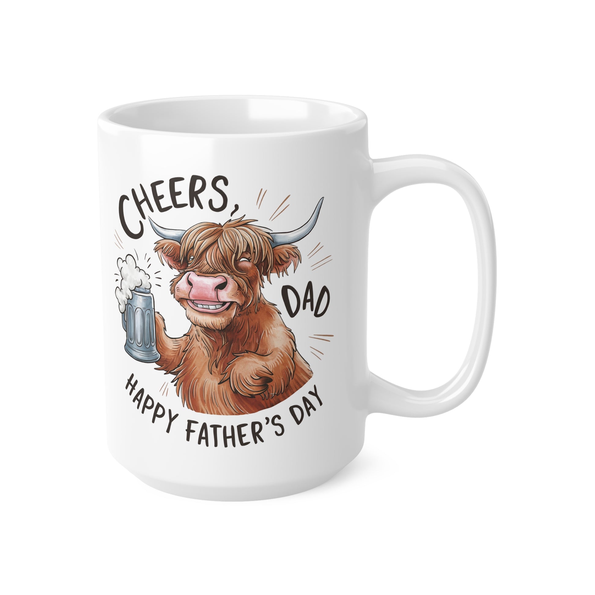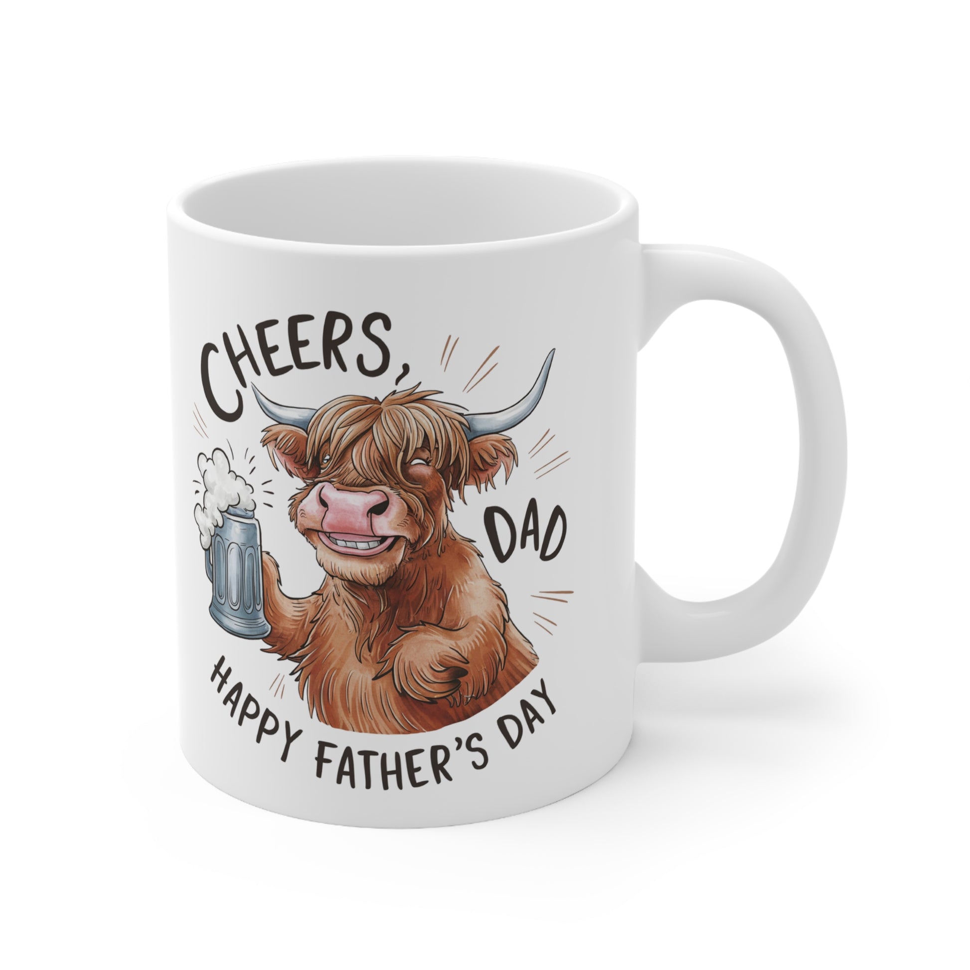 Highland Cow Coffee Mug - Cheers Dad Design, Father's Day Gift, Ceramic Tea Cup, Cute Animal Mug, 11oz & 15oz Options